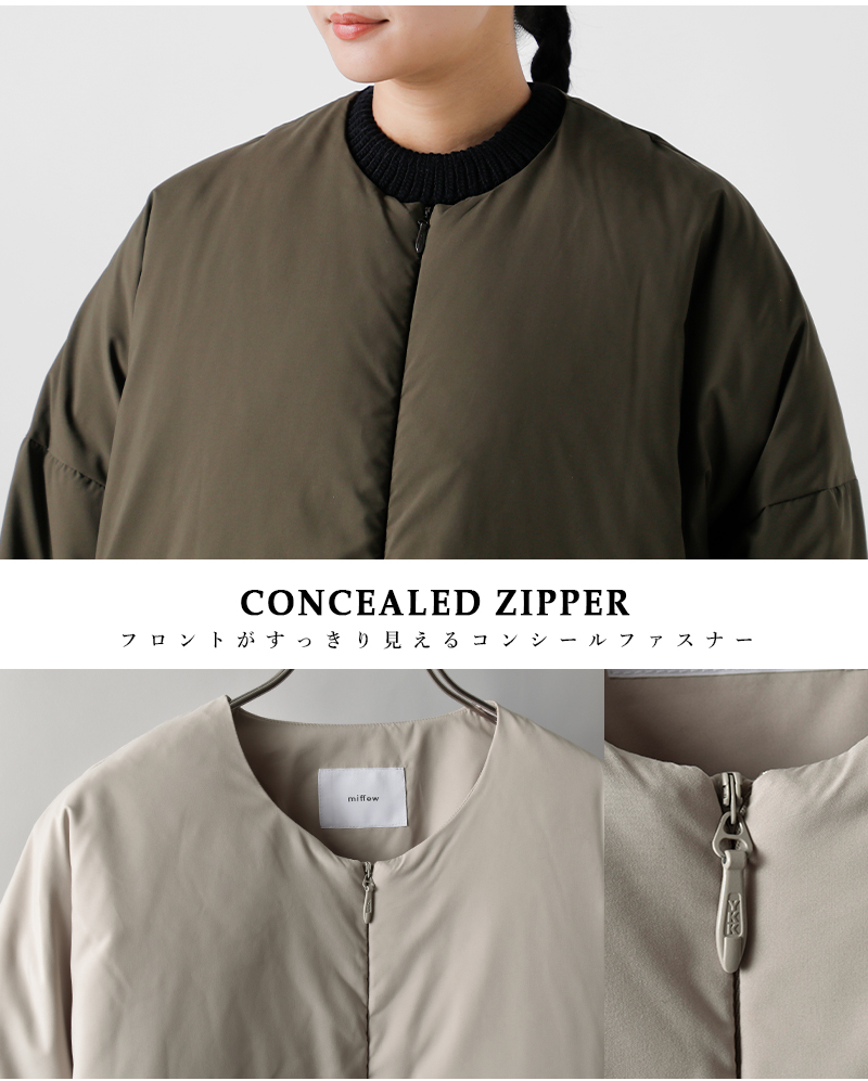 首元は程よい開きのノーカラーでスッキリとした印象に。ハイネックや巻物など、首元のオシャレも楽しめます。 コンシールファスナーでステッチも見えず、ミニマルな印象に。