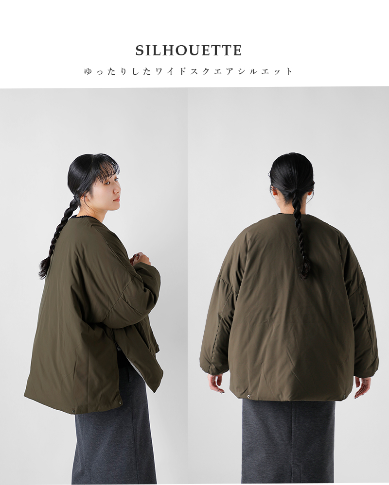 ゆったりとしたワイドスクエアシルエット。後丈の長いラウンドヘムでヒップラインのカバー効果も◎。ニットなど厚手のインナーでもさっと着こなせるシンプルな一着です。