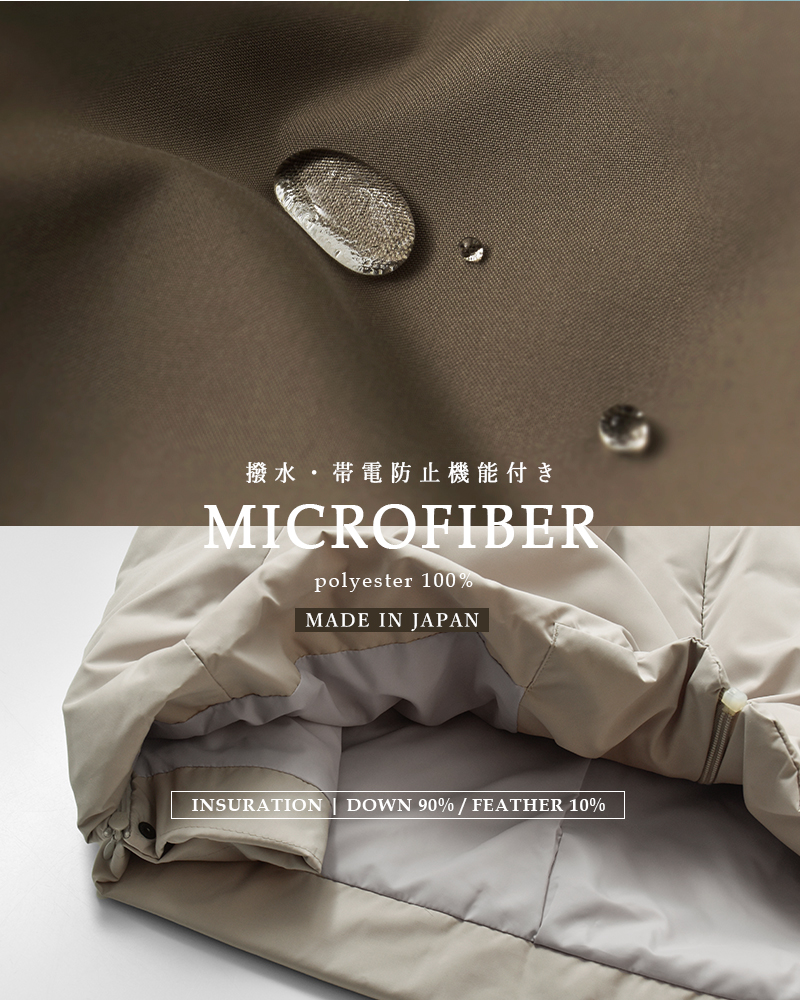 0.3デニールのポリエステルマイクロファイバー(極細糸)を高密度に織り上げることで、適度な厚みがありながら、軽量でソフトな風合いに仕上げた素材。表面には微起毛加工を施しているため肌触りは優しく、撥水、帯電防止機能も備えています。