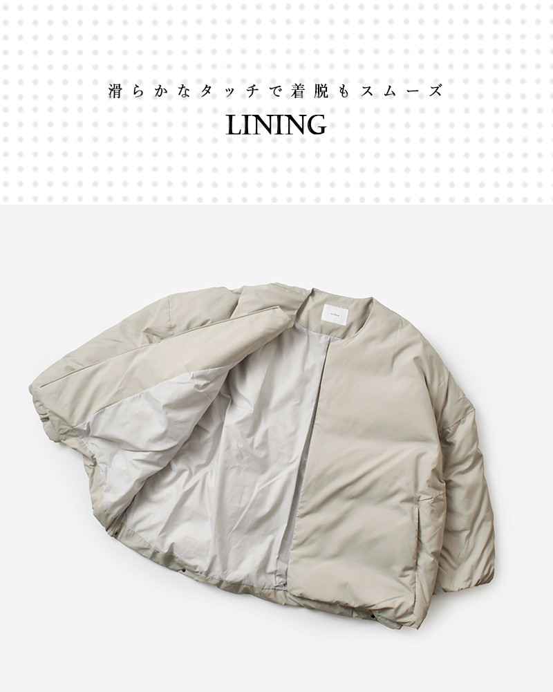 裏地はマットな表面感と滑らかなタッチ。滑りが良いのでニットの上からでもスムーズに羽織ることができます。