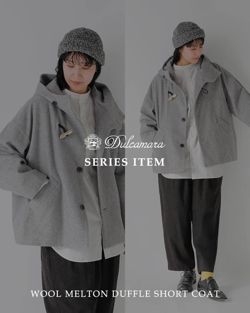 Dulcamara(ドゥルカマラ)よりウール メルトン ビッグ ハーフ コートのご紹介です。柔らかく温かみのあるウールメルトンを使用し、見た目にも着心地にもぬくもりを感じられる一着。フロントは比翼仕立てをベースに、3つのボタンのうち中央の一つだけをあえて表に見せるミニマルなデザイン。プレーンな佇まいの中に、Dulcamaraらしい控えめな遊び心が潜んでいます。ボタンにはブランドロゴ入りのオリジナルボタンを使用し、細部まで丁寧に仕立てられています。シルエットはゆとりあるビッグフィット。全体を包み込むような丸みと落ち感を持ちながら、肩の力を抜いて纏えるリラックス感が魅力です。総裏地仕上げで袖通りがなめらか、厚手のニットの上からでももたつかずに着られ、デイリーに活躍します。柔らかな素材感と静かな個性が溶け合った、冬のワードローブに頼もしい一着です。