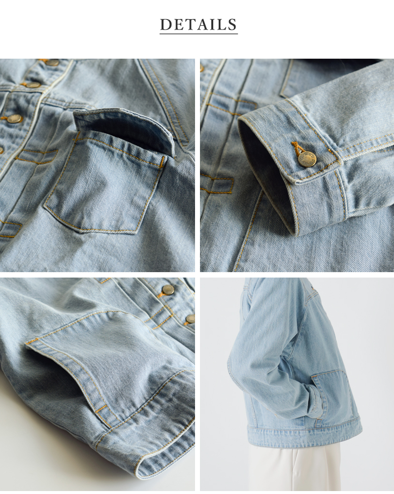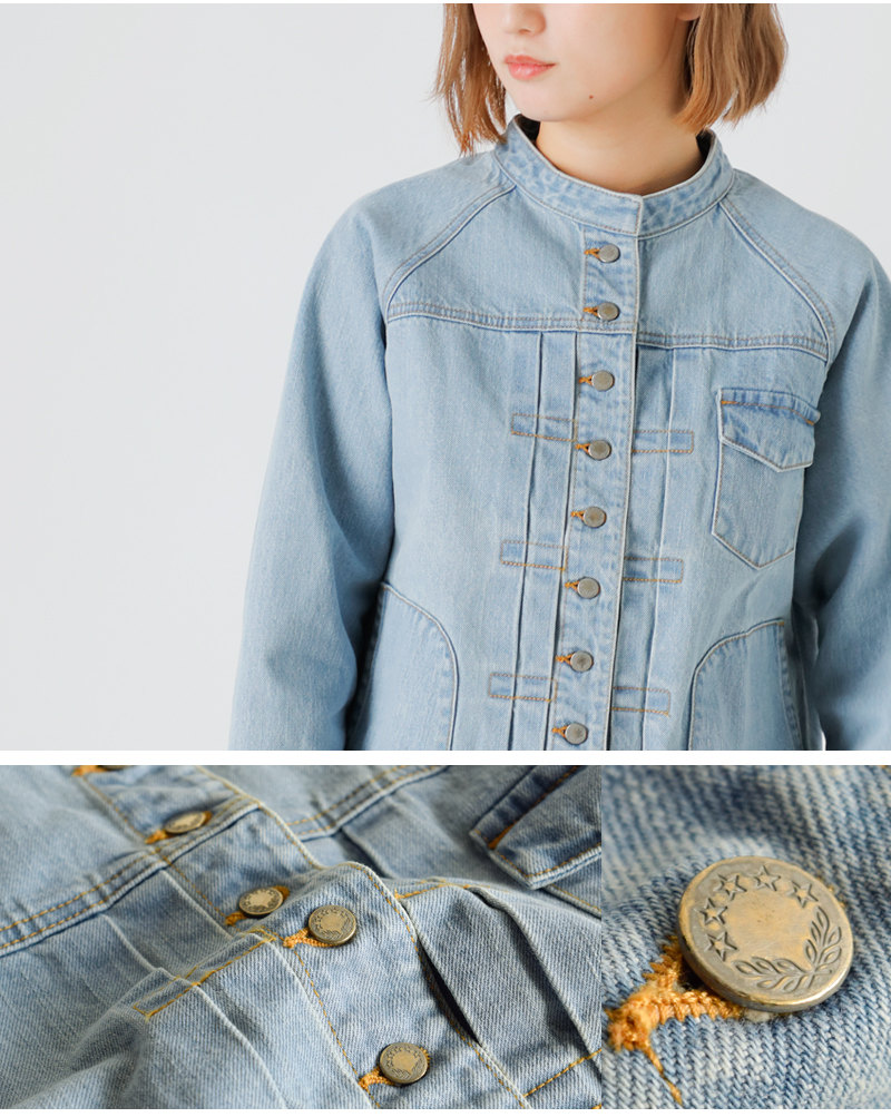 デニムジャケットには珍しいスッキリとしたバンドカラーでクリーンな印象。縦にたくさん並んだボタンも特徴です。イエローのステッチが、まるでアートのようで、いいアクセントになっています。