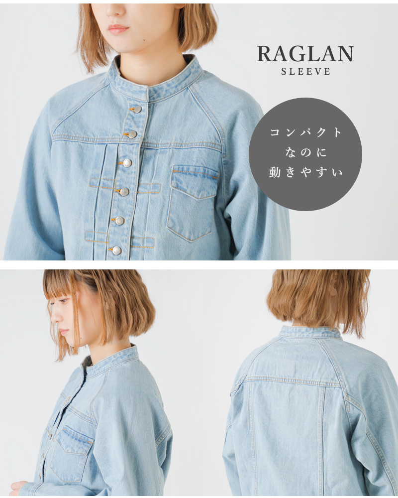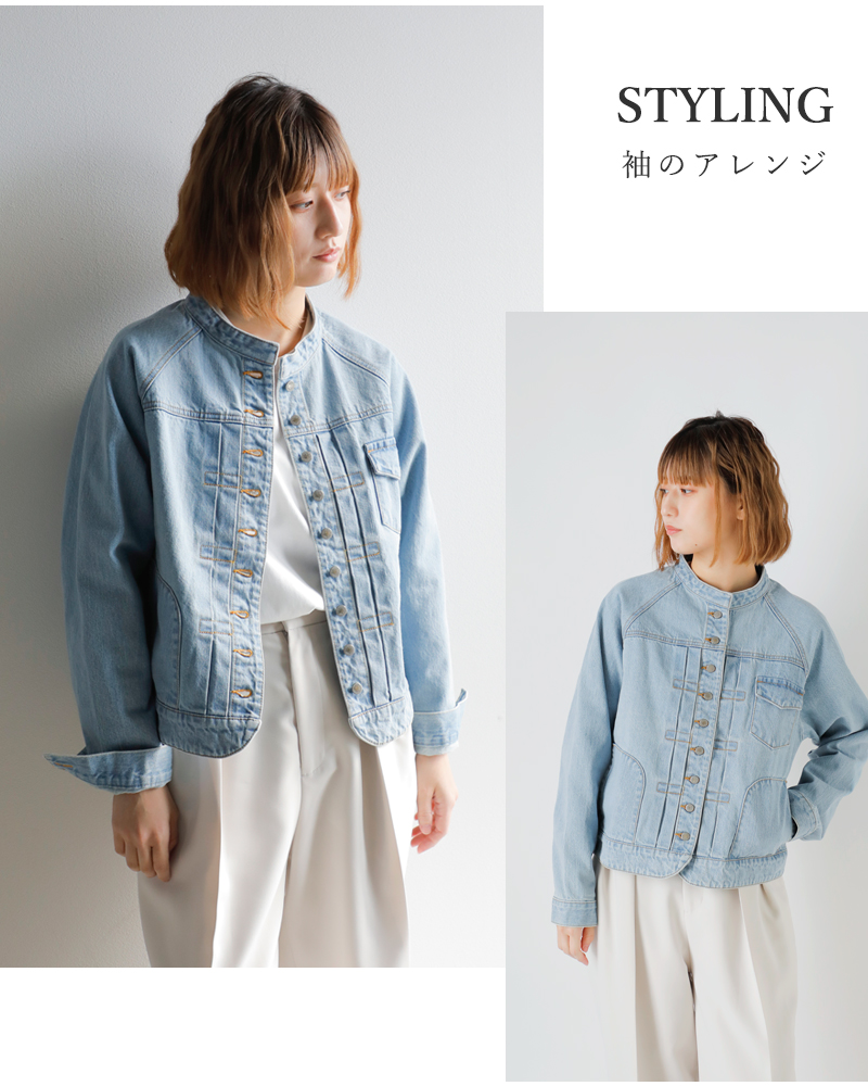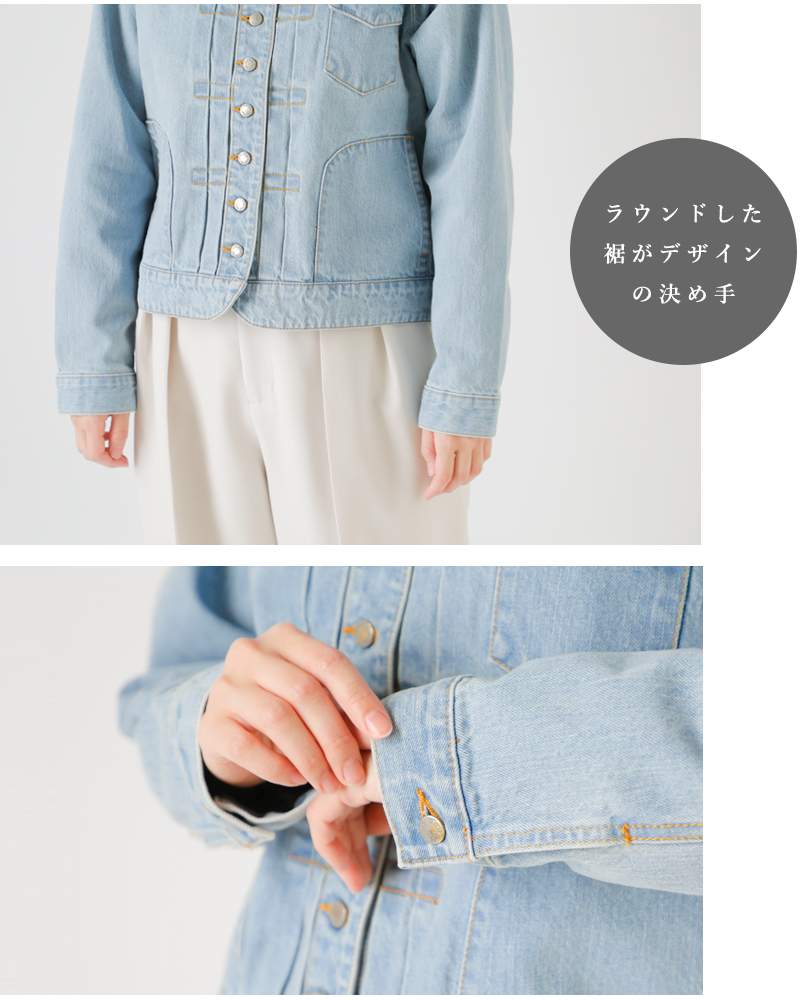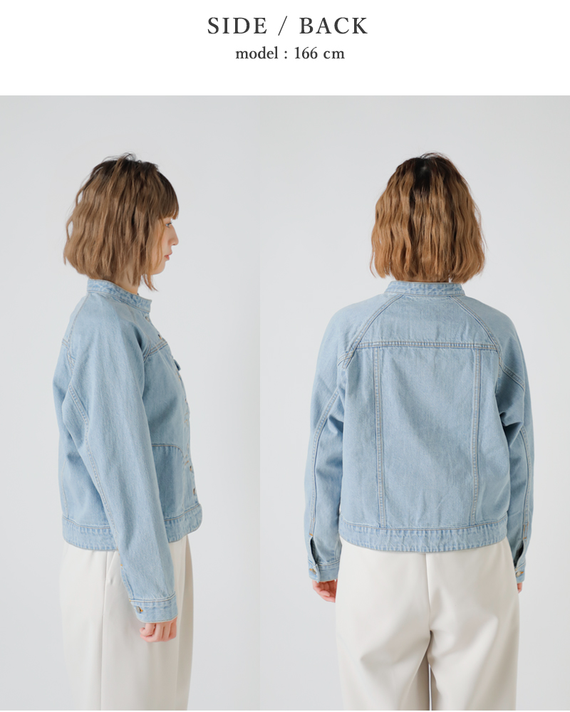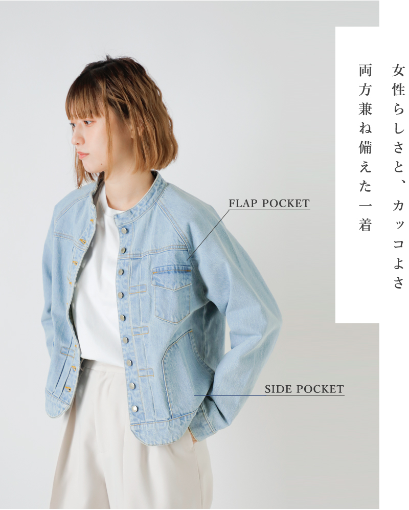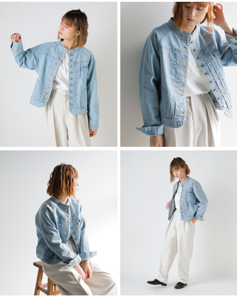 Si-Si-Si(スースースー)より、ブリーチ デニム バンドカラー ジャケット “BASIC DENIM JACKET”のご紹介です。人気のデニムジャケットから、ブリーチ加工バージョンが登場です。ひと工夫加えられた珍しいバンドカラーで女性らしく、すっきりとした首元に。ブリーチ加工を施した上質なデニムが魅力です。ラグランスリーブで肩回りが動かしやすく、肩まわりもしっかりカバーしてくれます。たくさん並んだボタンや、胸元のフラップポケットなど拘りの詰まったディティールも見逃せません。カジュアルながら、どこか上品さも感じさせる一着に仕上がっています。