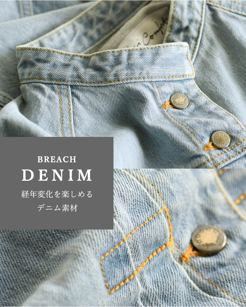 着こむほどにニュアンスのある表情に変化し、経年変化を楽しめるブリーチ加工のデニム素材。生地も柔らかく、着始めからストレスフリーな着心地です。デイリーに使って育てたくなる、愛着のわく1着。オールド感の漂うイエローのステッチワークも人気で、全体のいいアクセントになっています。