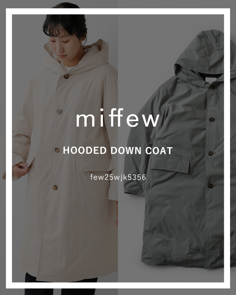 miffew(ミフュー)よりフーデッド ダウン コート “HOODED DOWN COAT”のご紹介です。ダウン量を細かく調整することでボリューム感を軽減し、すっきりとしたフォルムに仕上げたフーデッドジャケット。ステッチやパーツを控えめにし、カジュアルさを残しながらもシンプルで上品な印象にまとまっています。袖口は外気の侵入を防ぐシャーリング始末、裾はメタルストッパーでシルエットの調整が可能です。両胸の内側にはジッパーポケット付き。